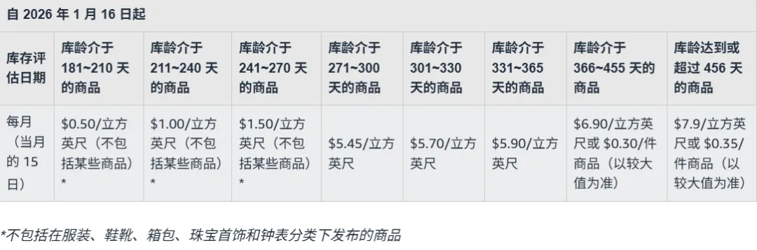 也就意味着,2026年1月15日起,亚马逊超龄库存附加费大幅上涨,这个费用将在每个月15日自动更新,所以卖家们在15日之前要完成超龄库存的清点。