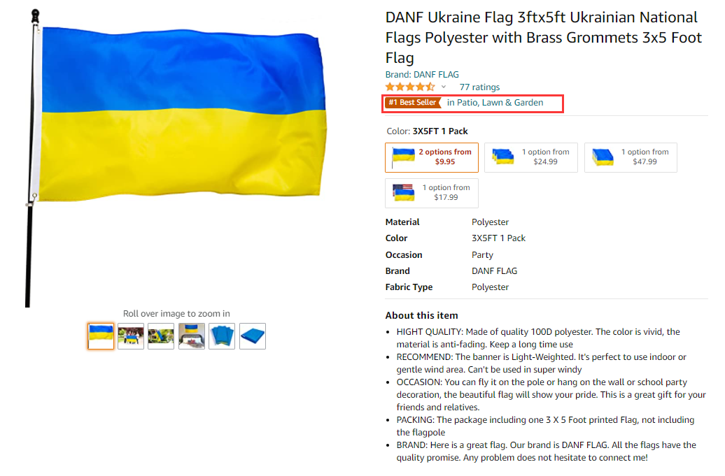 乌克兰的国旗,包括标语、横幅之类的,在亚马逊各个站点都有售卖,有的冲上了榜单甚至榜首,自发货的店铺居多。上架时间非常短,有的是在2月25日、2月26日才上架。