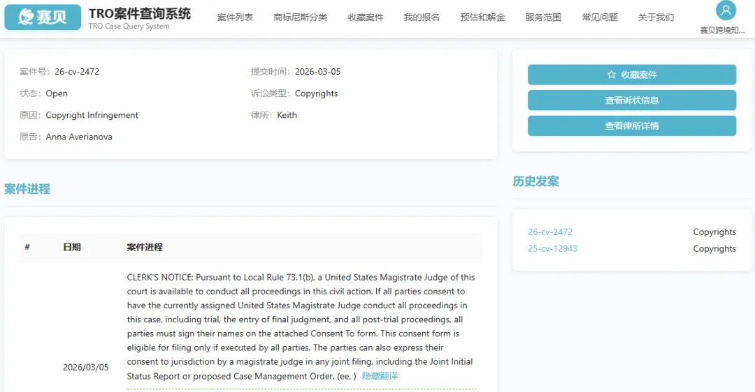 目前案件还未有重大进展,从案件详情页面中可以看到原告在25年10月份也发起了TRO维权,案件号为25-cv-12943;