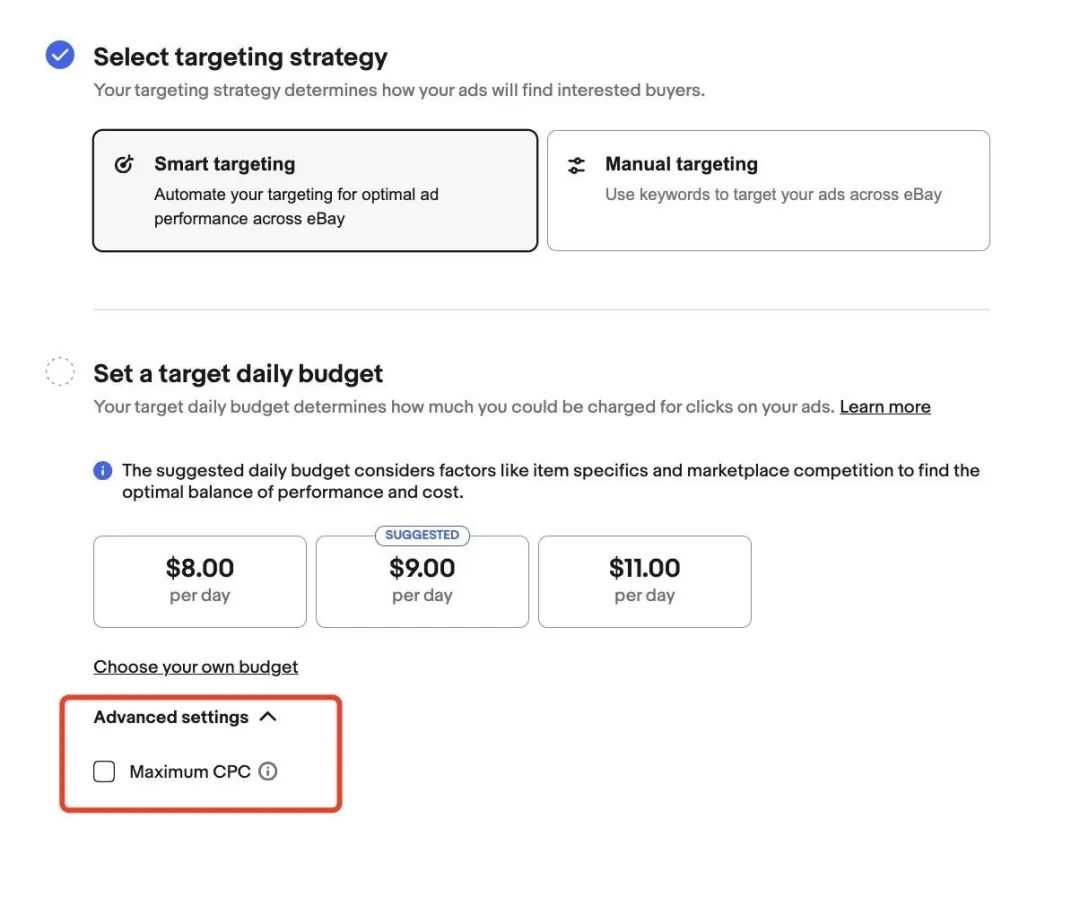 如果您未在此处勾选每次点击费用上限(默认不勾选),那么eBay将自动优化该智能定位广告活动每次投放时的竞价。您的广告活动可以更加灵活,时刻与市场状况和刊登的竞争力保持一致。
