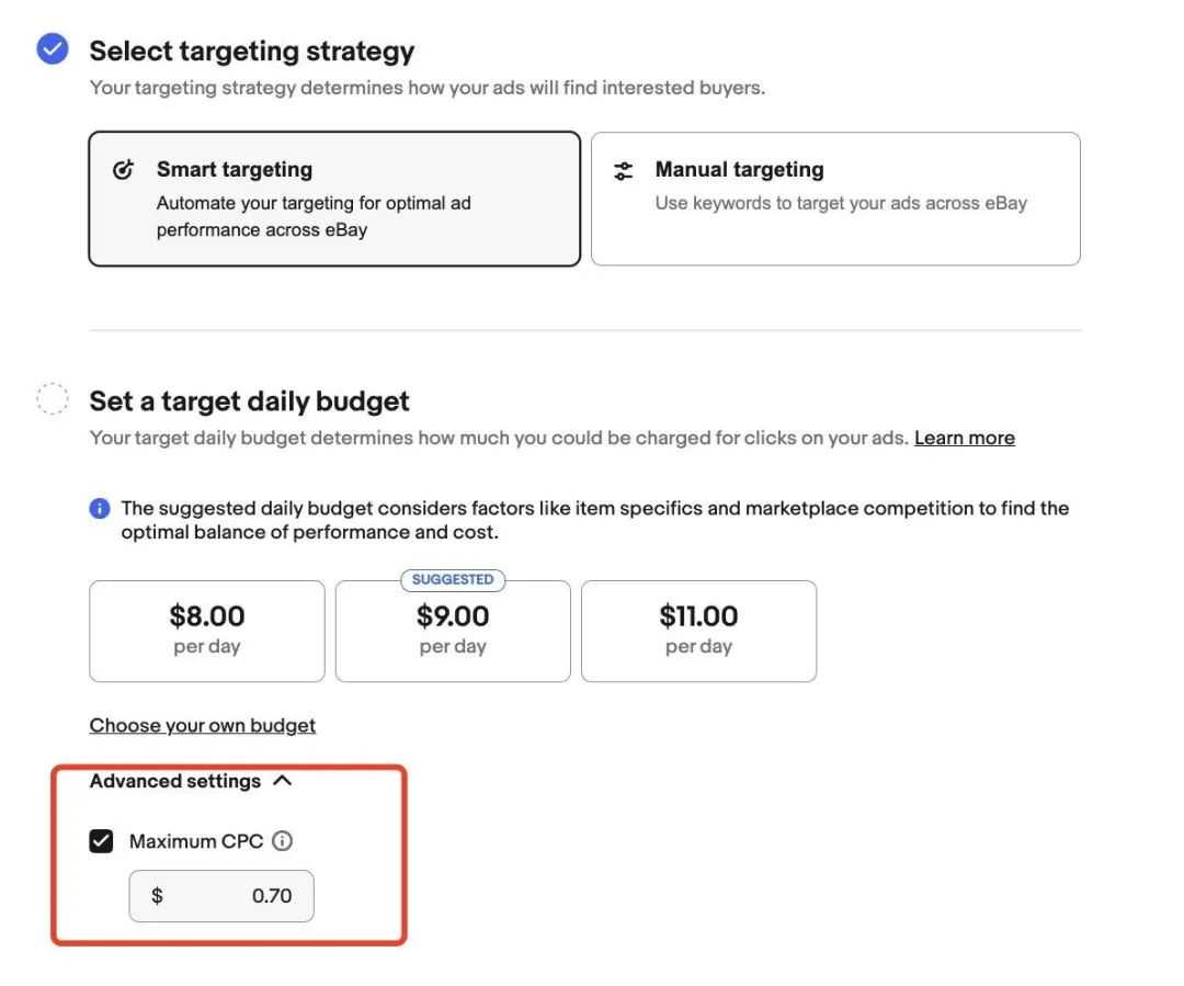 eBay会根据卖家选择的物品刊登的历史投放表现,提供一个每次点击费用上限的参考值。您可以采纳这个数值,也可以手动调整。如果您手动设置的每次点击费用上限值低于推荐值,我们将在旁侧作出提醒,以让您的智能定位广告活动保持竞争力。