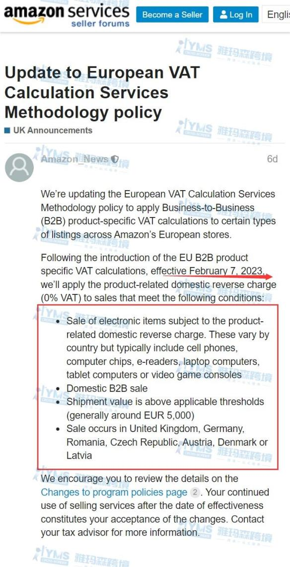 亚马逊欧洲站近日(2023年1月29日)发布公告称,亚马逊正在更新欧洲增值税计算服务政策,以将企业对企业(B2B)特定产品的增值税计算应用于亚马逊欧洲商店的某些类型的商品。