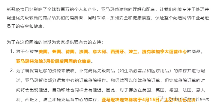 对于存放在美国、英国、德国、法国、意大利、西班牙、波兰和捷克运营中心的库存,亚马逊决定免除将于4月15日产生的长期仓储费。