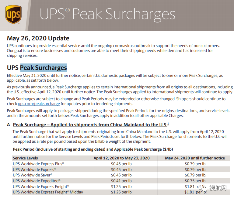 从5月31日起:UPS将对使用UPS Ground和SurePost服务的用户征收30美分/包裹的附加费。这项附加费针对二月份平均每周包裹量超过25,000个以上的寄件人征收;