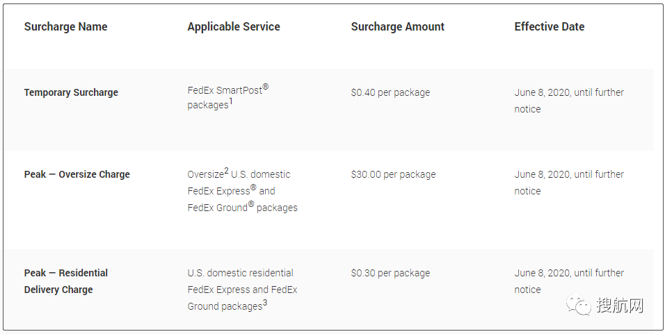 联邦快递将从2020年6月8日开始实施三项高峰时期临时附加费:
