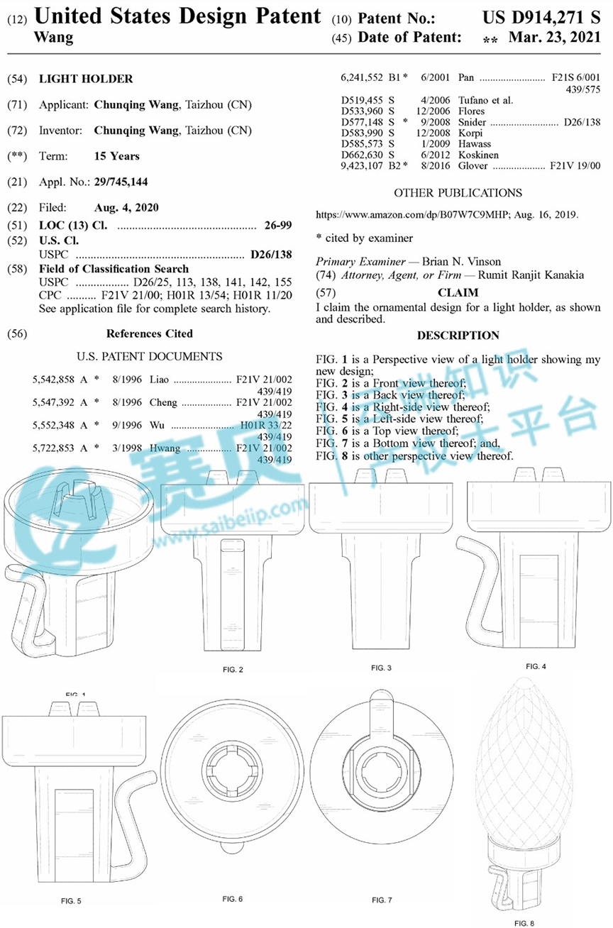 本案涉及一项美国外观设计专利USD914271S,最早申请日期是2020年8月4日,下证日期是2021年3月23日,在此之后上架的相关外观产品或有侵权风险。