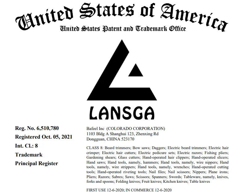 LANSGA商标注册在第8类手工器械,商标号6510780,有卖同类产品的需注意排查,未经授权切勿在listing上使用: