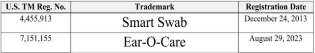 涉案商标Smart Swab、Ear-O-Care,商标号分别为4455913、7151155: