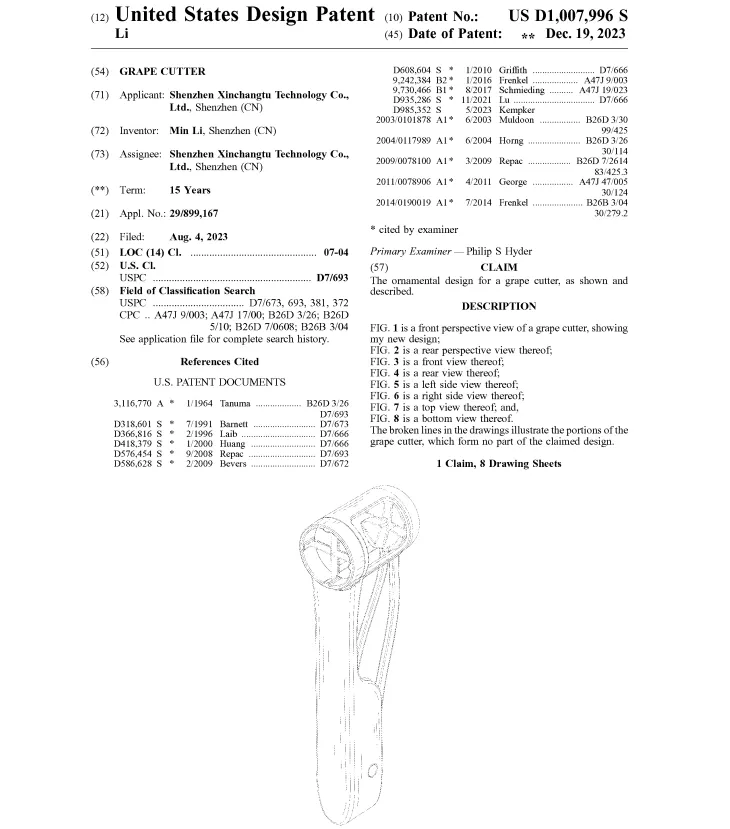 涉及名为Grape cutter的美国外观专利,专利号USD1007996S,2023年8月4日申请,2023年12月19日下证: