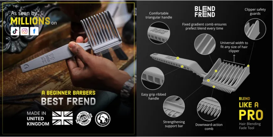 男士美发工具品牌Blend Frend旨在帮助新手理发师和在家理发的人士更轻松地修剪短发,通过技术创新提供差异化的解决方案,其核心产品是一款革命性的渐变发型工具(理发梳子)。