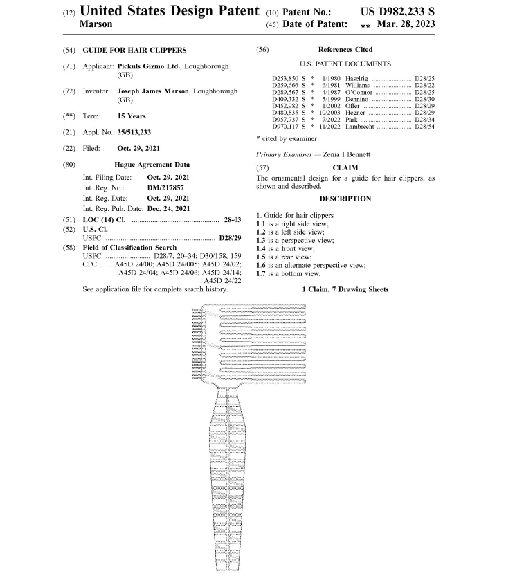 涉及的是名为Guide for hair clippers的美国外观专利,专利号USD982233S,2021年10月29日申请,2023年3月28日下证: