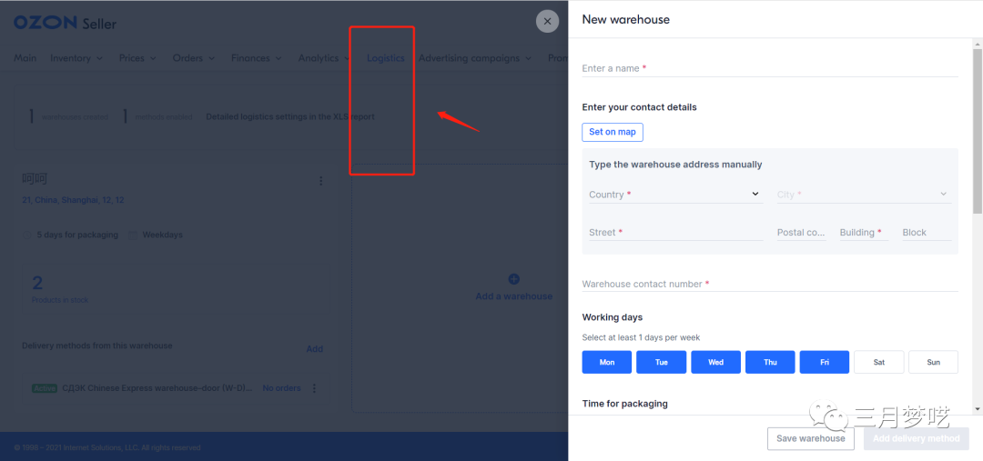 注意在填写仓库地址时,OZON自发货模式的仓库是虚拟仓库的一个概念,需要填写的地址其实就是发货地址,可以填自己地址或公司地址。