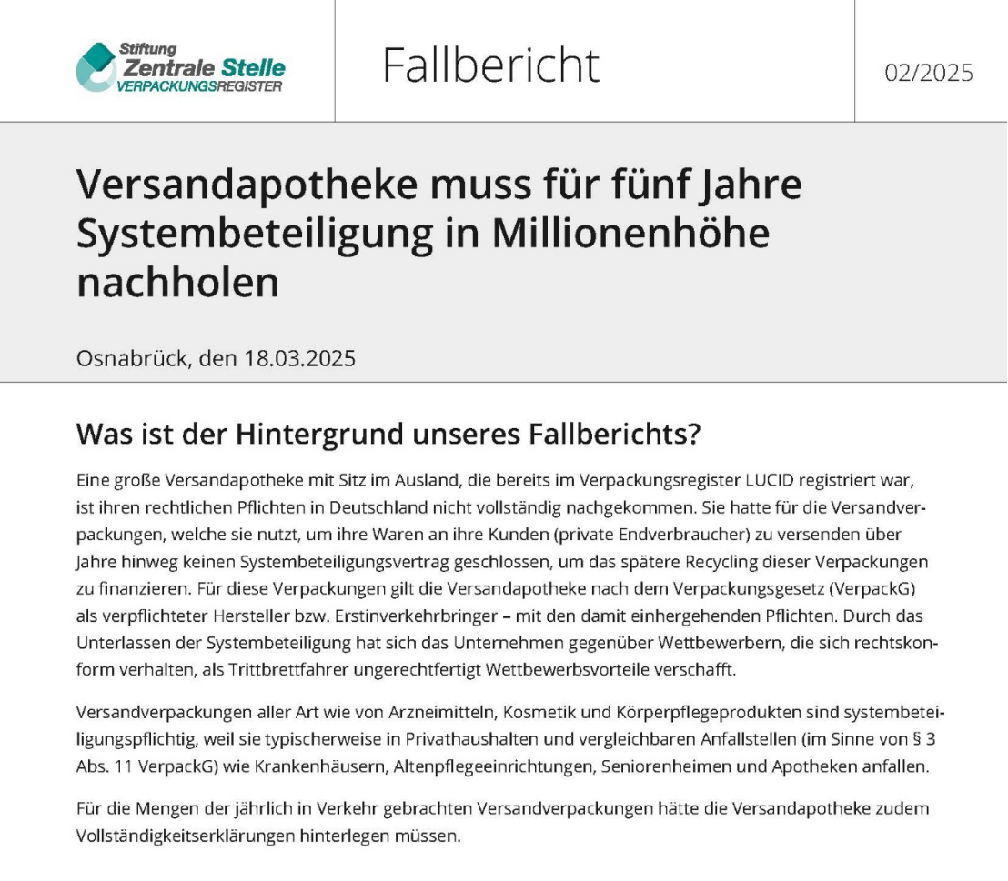 德国中央包装登记局平台LUCID最近公告了一单关于违规罚款的真实案例。德国境外的一家邮寄药店因为没有遵守德国包装法规定而被罚款至少200万欧元。这家公司因为直接从德国境外邮寄产品至德国消费者,因此符合《德国包装法》规定里的生产商(producer),所以他们必须正确履行包装法规定的义务,为其寄至德国的包装购买回收。