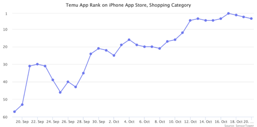 Temu出海已2月有余,凭借低价策略在美国市场引发了消费狂欢。自上线以来,Temu在美国的下载量飞速上升,上线仅两周便成为最受欢迎的安卓购物应用App。10月15日,Temu在美国苹果应用商店的购物板块中排名第五;10月17日,升至第二,仅次于Amazon;据Sensor Tower10月27日的数据显示,其排名位居Goole play美国免费购物应用的榜首。