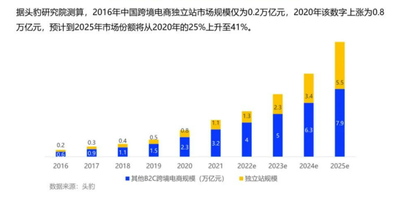 根据亿邦智库发布《2021跨境电商金融服务报告》显示,2021年,28.5%跨境卖家建设了独立站,8.6%跨境卖家表示销售额最大的渠道是独立站。据预测,未来三年中国独立站卖家数量将超过50万。中国跨境电商独立站市场规模预计到2025年市场份额将从2020年的25%上升至41%。跨境独立站行业整体是向上的!