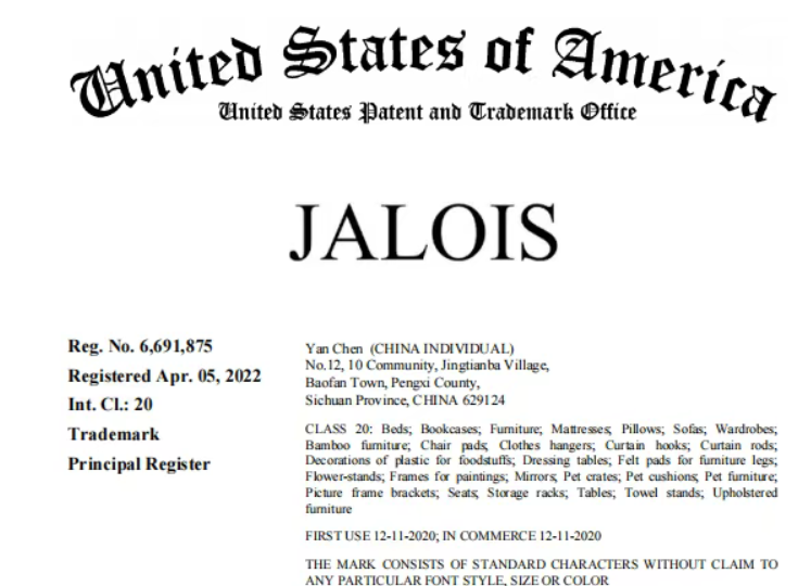 原告品牌JALOIS是由中国跨境卖家Yan Chen在 2020 年前后创建的创新家居品牌,专注服装衣架、家具、宠物家具等实用型家居产品的设计与销售,风格兼具创意与品质感。