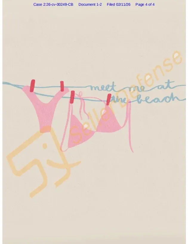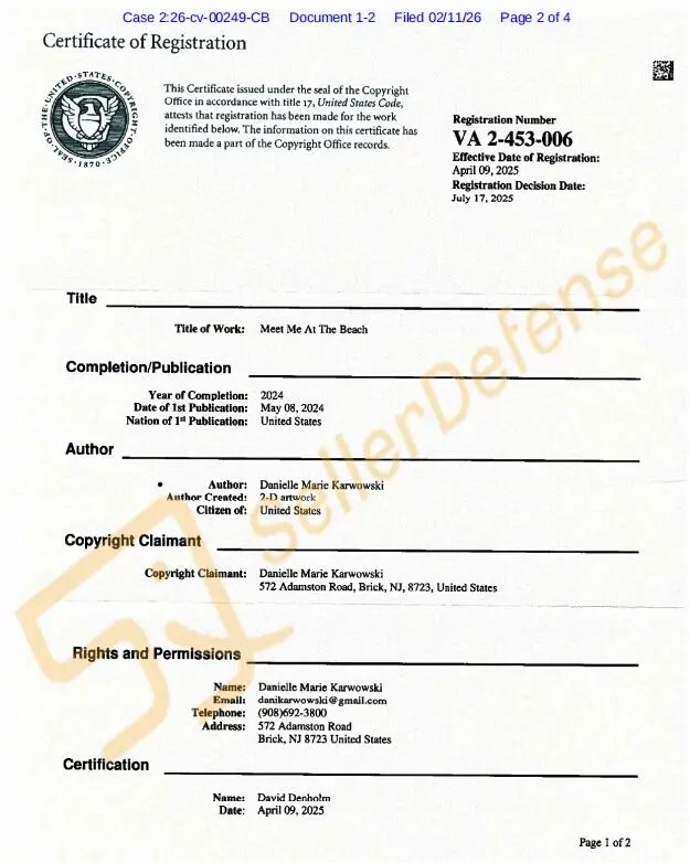 原告 DANIELLE MARIE KARWOWSKI 是一位技艺精湛的艺术家,擅长海岸主义风格绘画。她的作品融合了摄影、平面设计、字体设计以及她自己的手绘设计。