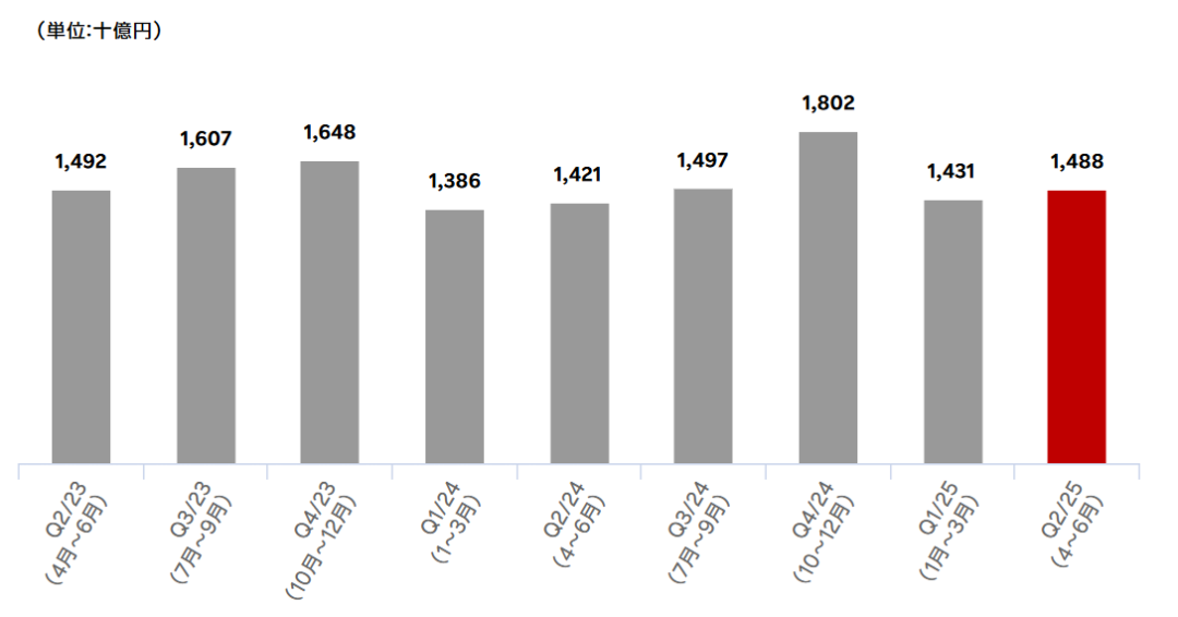 其中,国内电商总销售额分项如下:核心业务增长3.3%至2.5913万亿日元,增长投资业务增长9.5%至3271亿日元。截至2025年6月底,店铺经营者数量为5.5万家,连续第二个季度下降。”