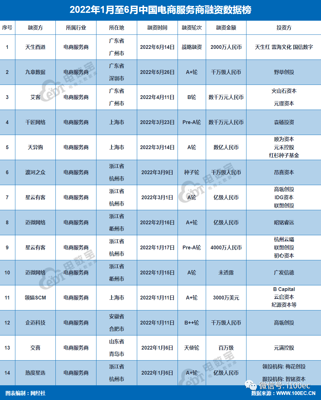 据“电数宝”电商大数据库(DATA.100EC.CN)显示,2022年1月至2022年6月,国内数字零售中电商服务商领域共发生了14起投融资事件,融资总额超过8亿元,涉及的公司包括:九章数据、艾客、千匠网络、天异购、渡河之众、星云有客、迈微网络、领猫SCM、企迈科技、交喜、热度星选等。