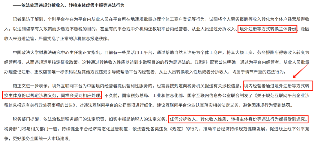 在披露涉税信息报送进展的媒体报道中,相关操作也遭到了税务局点名。该报道指出,个别平台或中介机构存在教唆平台内经营者、从业人员通过分拆收入、境外注册等方式转换主体身份、隐匿收入来逃避监管的行为,严重扰乱了正常的涉税信息报送秩序。