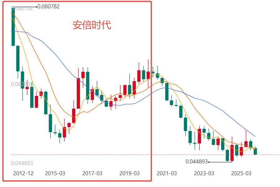 安倍在2012年当选日本首相之后,奉行的是宽松的货币政策,铁腕手段主导日元贬值大戏。日元兑人民币汇率连跌三年,从100:8直接干到了最低100:5.1。此后,从2016年到2020年,一看形势不对,日元兑人民币又开始缓慢回升到6.5。安倍卸任以后,日元继续跌,最低干到了100:4.4。