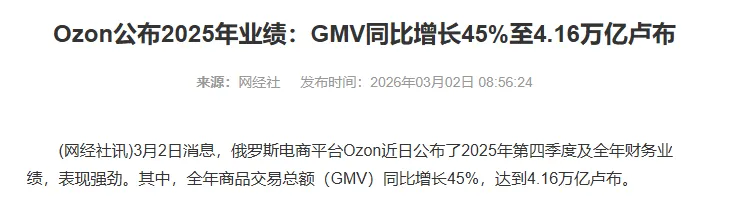 我看Ozon官方发的2025年财报,GMV涨了45%,冲到接近4.16万亿卢布了。平均每位用户年下单次数增至38次,下单人数算下来占了俄罗斯人口的三分之一还多。这说明平台的基本盘非常稳,整体的流量在提升。