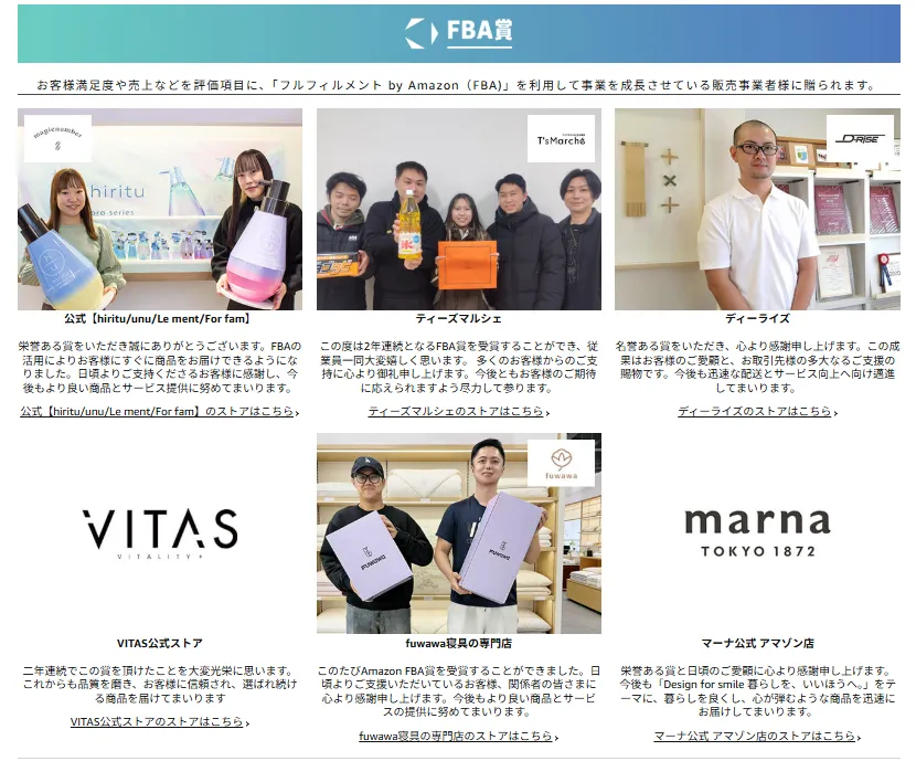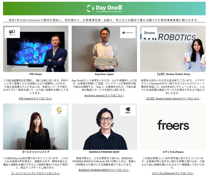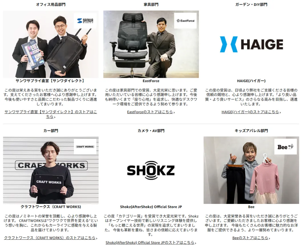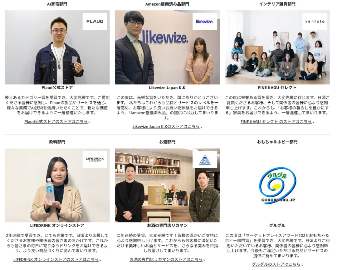 Amazon Japan Marketplace Awards是基于客户满意度(高评价)、高销量和亚马逊服务利用率等标准的综合评估,每个类别中的佼佼者都将获得表彰。