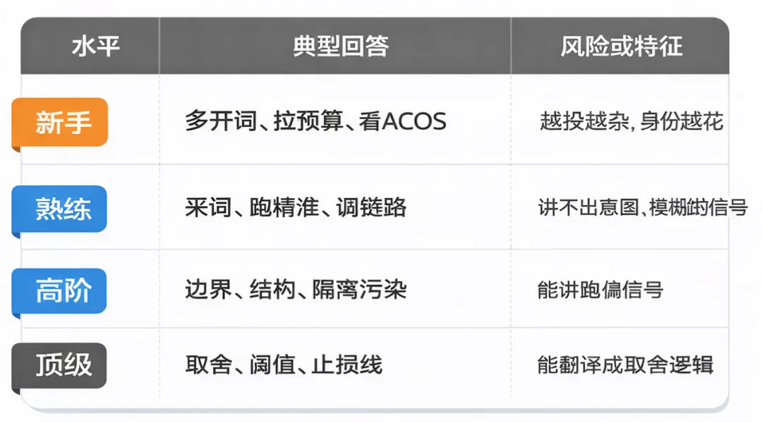 3. 高阶运营的回答:他会先谈“意图证据”,再谈投放