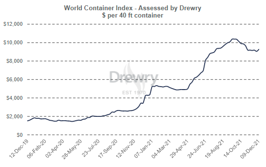 德鲁里9日最新综合世界集装箱指数上涨2.3%至每40英尺集装箱9262.02美元。并且仍比一年前高出170%。由其评估的年初至今的WCI平均综合指数为每40英尺集装箱7484美元,比每40英尺集装箱2739美元的五年平均值高出4745美元。