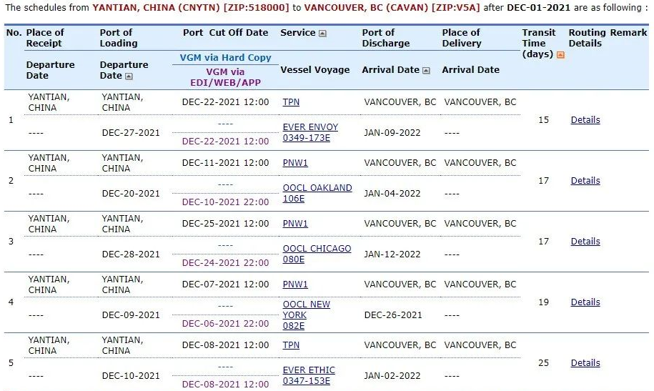 长荣海运,OOCL,COSCO从盐田港--加拿大温哥华港一共只有5个航次的船期: