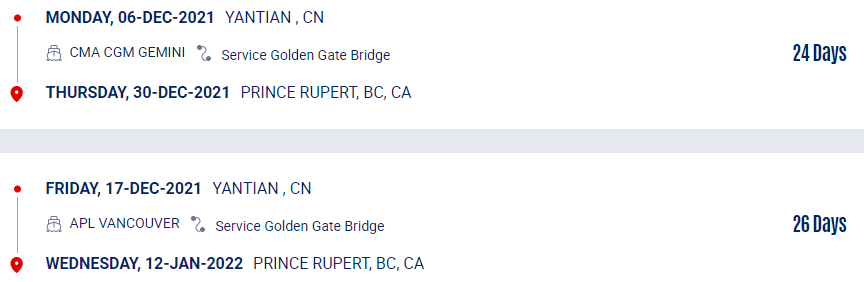 CMA 深圳盐田-鲁珀特王子港,12月份也只有2艘船: