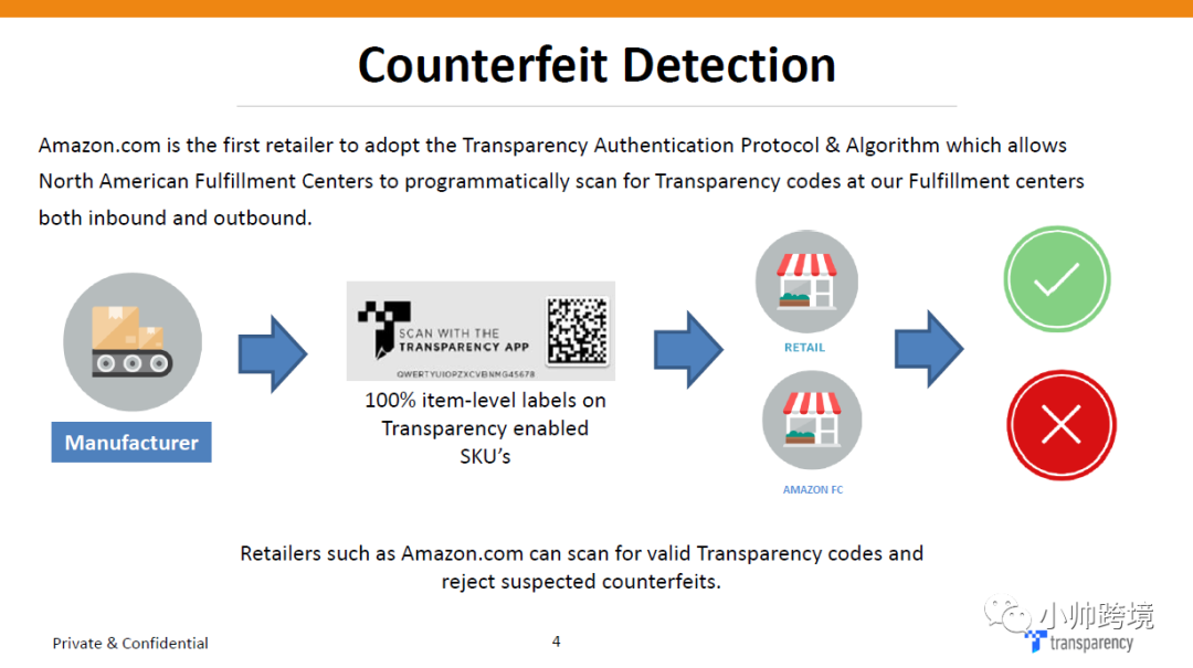 2. 防止假冒产品:这是品牌方比较关注的一个功能了,也是防跟卖的关键。品牌方可以选择将二维码打印在产品包装上或者通过粘贴标签方式来实现,提高品牌形象:参加透明计划能迅速帮助自己树立良好的品牌形象。