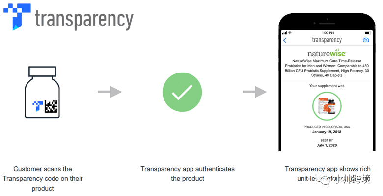 透明计划是产品会被贴上“透明二维码(Transparency code)”(一个蓝色T标),这是一个加密的字母数字代码、能生成唯一的二维码标识符,这个二维码标识符会对应到参加透明计划的SKU上,透明计划开始后,买家只需要使用亚马逊的 Transparency APP 扫描图中所示的产品外包装上的“透明标签”,马上就能识别产品的真实性,以及从生产到销售的整个过程包含的信息,比如生产地址、生产日期、成分以及材料来源信息等等。