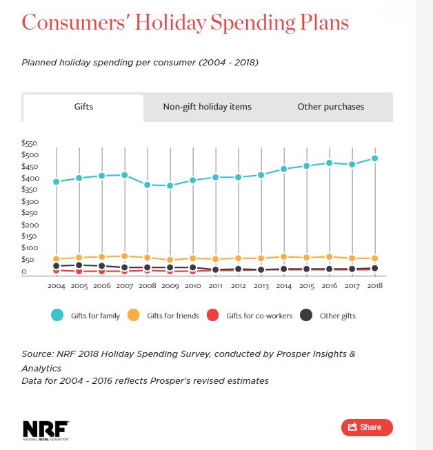 圣诞季也可以称为“礼物季”,因为消费者要把假日购物季最多的购物预算都消费在“礼物”上。在NRF对消费者的一项假日购物调研中显示,消费者在节日期间主要有三类消费:礼物;食品、装饰等非礼物类以及其他价格合适的消费。