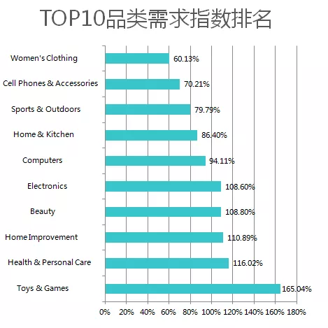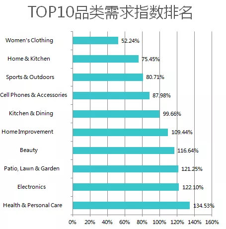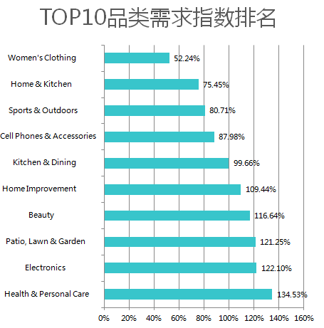 134.53% 122.10% 121.25%# 品类 需求指数 1 Health & Personal Care 2 Electronics 3 Patio, Lawn & Garden