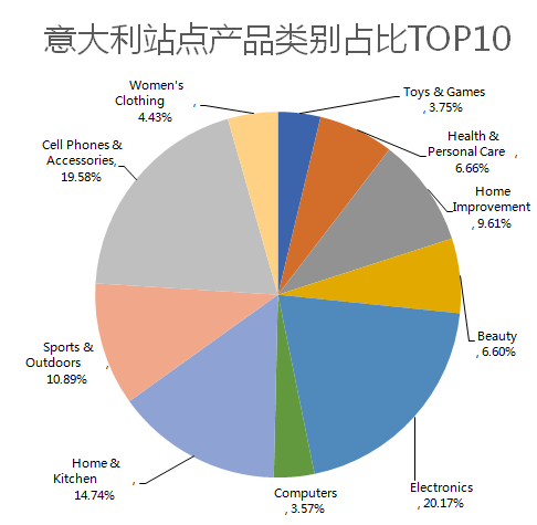 (贴心奉上TOP10品类) 痴迷细节与电子科技的德国人,在4月份也依旧青睐于电子产品,且比例超过20%,来到20.82%,厨房家居用品在4月更受欢迎,手机配件已然屹立不倒,位列第三;户外用品的需求在逐步上升,家居装饰用品也开始迎头赶上。 意 大 利 意大利站点的消费者领码占比最多的品类前5分别是: 20.17% 19.58% 14.74% 10.89% (贴心奉上TOP10品类) 来到意大利市场,电子产品和手机配件依旧深受意大利人的喜爱,厨房用品的比例也在稳步上升,户外用品随着天气的回暖及温和也成为意大利人民购物车里的必备;家居装饰用品的提升又是不是揭示着新的市场商机呢? 而在这里,小V要给大家透露一个大秘密哦~ 在四大站点中,意大利站的领码量已经跻身第二名,仅次于美国,意大利站点的市场活力不容小觑哦~ 从品类需求指数排名,看选品趋势