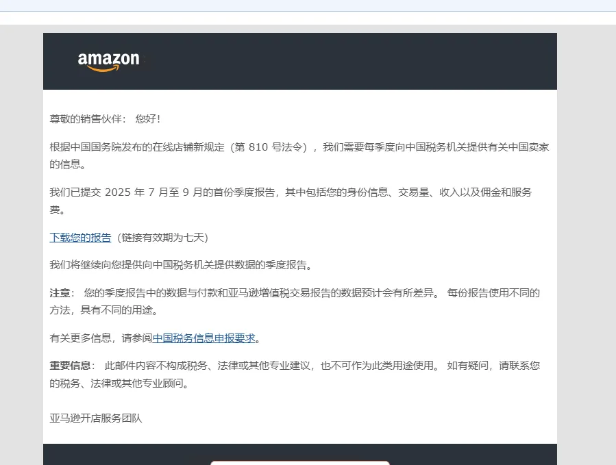 今天亚马逊突然向卖家集体发送了各站点店铺三季度的中国税务报告