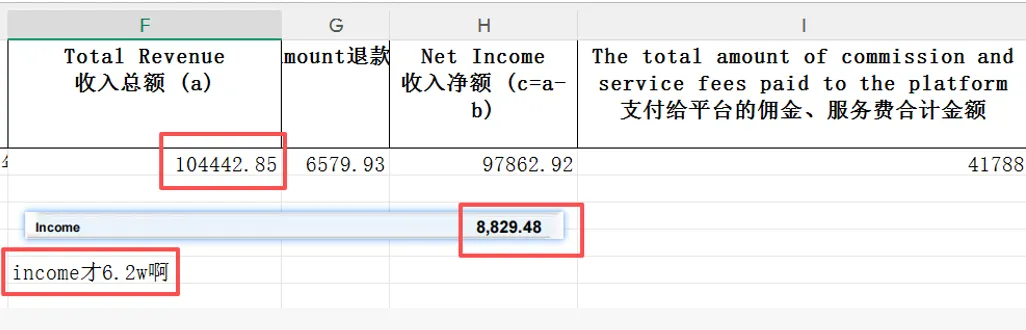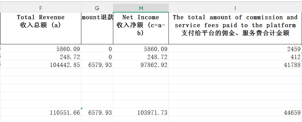 具体包括销售金额、退款金额、收入(销售-退款)、卖家支付的服务费等