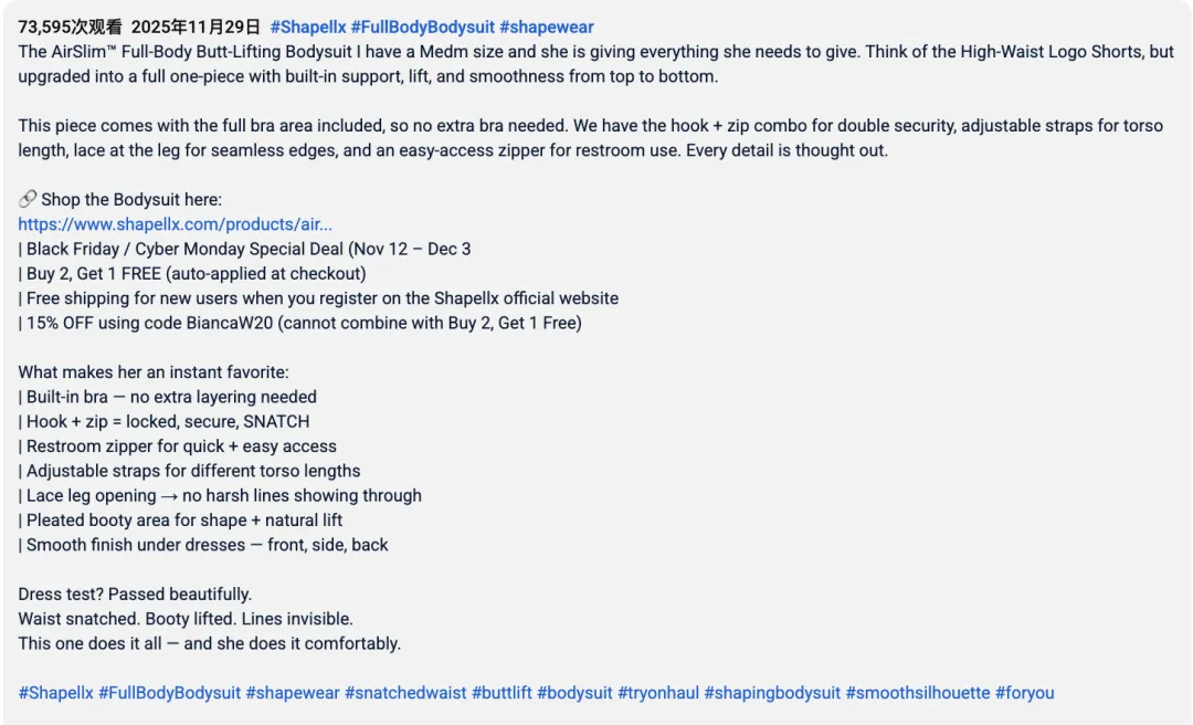 通过Bianca标志性的试穿评测、实用教程与真诚分享,Shapellx完成了超越单纯广告的深度沟通。她不仅展示了产品,更诠释了一种自信、健康的生活方式,从而在海外市场实现了有效的产品曝光与带货引导,将流量转化为真实的消费动力。