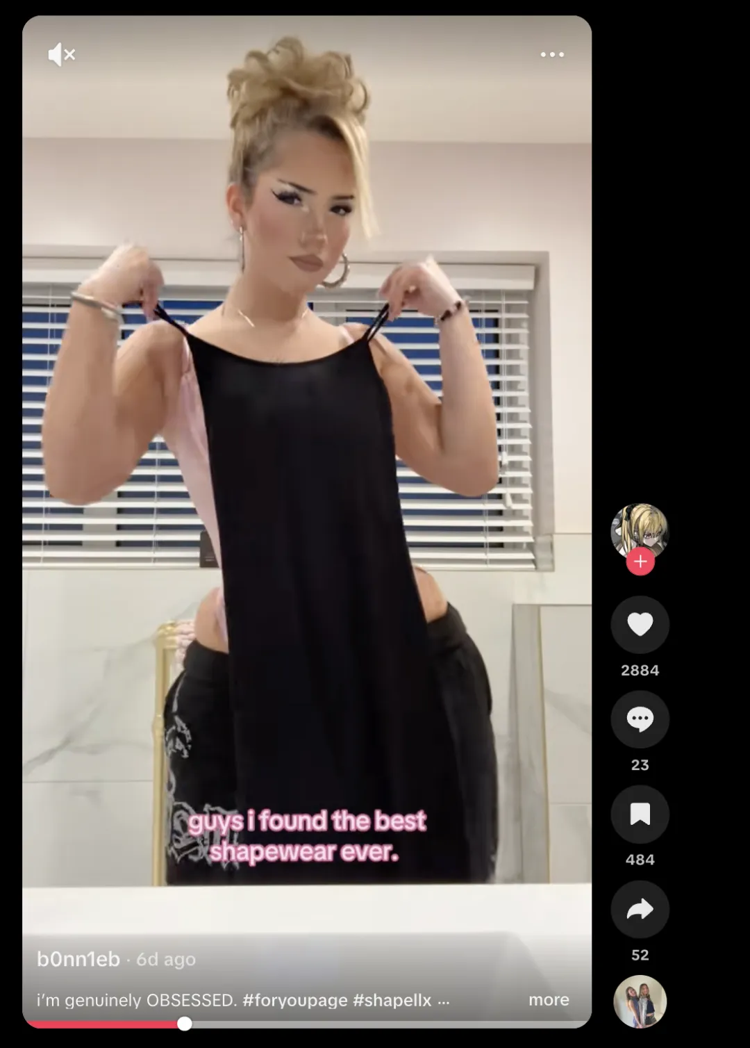 与Shapellx的合作,b0nn1eb将品牌塑身衣的卖点浓缩为十几秒内极具冲击力的视觉语言。在一支获得16.7万次播放的视频中,她通过直接的镜前“前后对比”,直观演绎了产品收腰塑形的戏剧性效果。