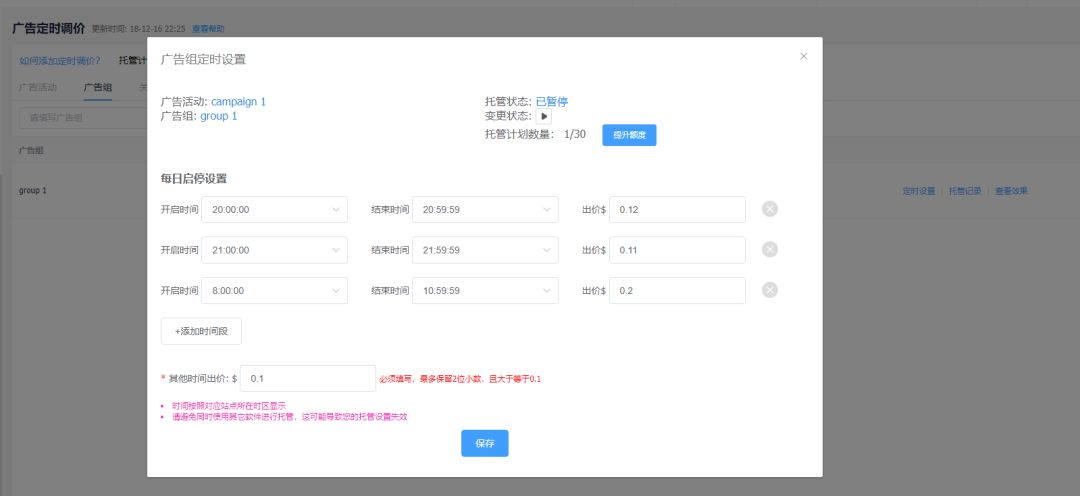 卖家可以对每一个广告活动或者广告组进行对应的设置(广告活动仅支持定时,广告组和关键词定时调价都支持)为了防止非广告时间关闭广告导致listing被降权,系统还贴心地对其他时间的出价进行设置。