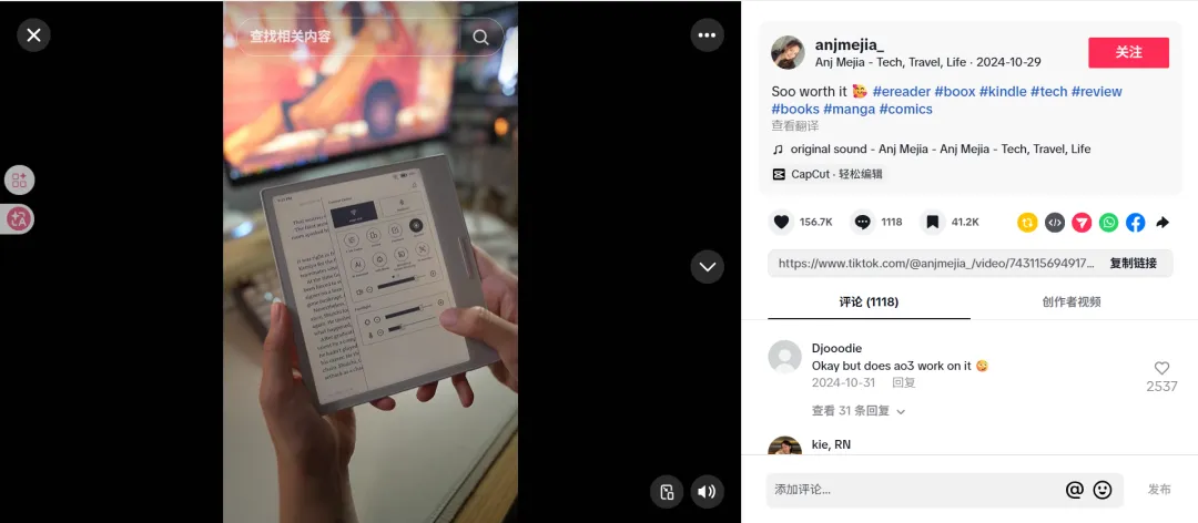 不仅限于此,文石BOOX也在其他领域下足了红人营销。在与TikTok美妆博主jen.chae的合作中,以软广的形式分享了产品的使用,收获了50.8万点赞,3500条评论,为文石BOOX在海外带来了大量的用户关注和良好反馈。