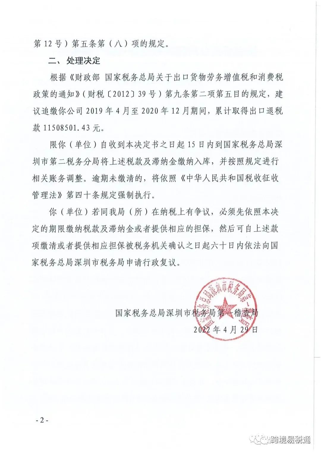 根据《财政部国家税务总局关于出口货物劳务增值税和消费税政策的通知》(财税〔2012〕39号)第九条第二项第五目的规定,建议追缴你公司2019年4月至2020年12月期间,累计取得出口退税款 11508501. 43 元。