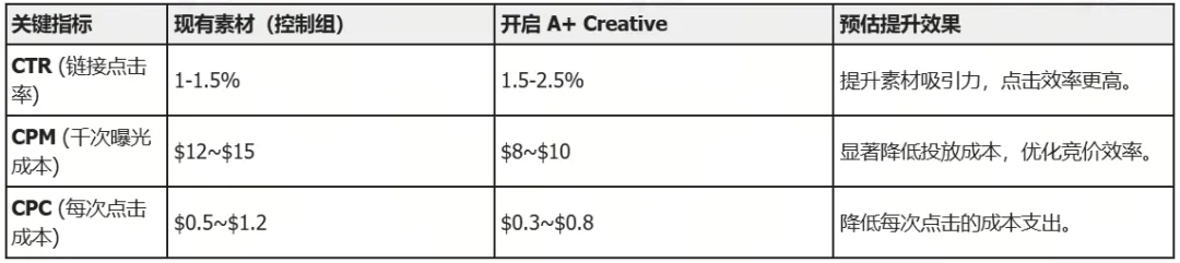 素材:使用与控制组相同的核心素材,开启 A+ Creative 自动增强