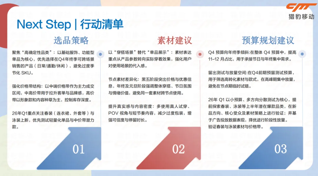 26年 Q1 以小预算、多方向分散测试为核心,提前探索春装、泳装等上半年潜在爆款品类,在新品方向、核心受众及素材策略上进行验证;并基于广告投放数据表现,择优进行阶段性放量。验证春装与泳装素材与价格带。