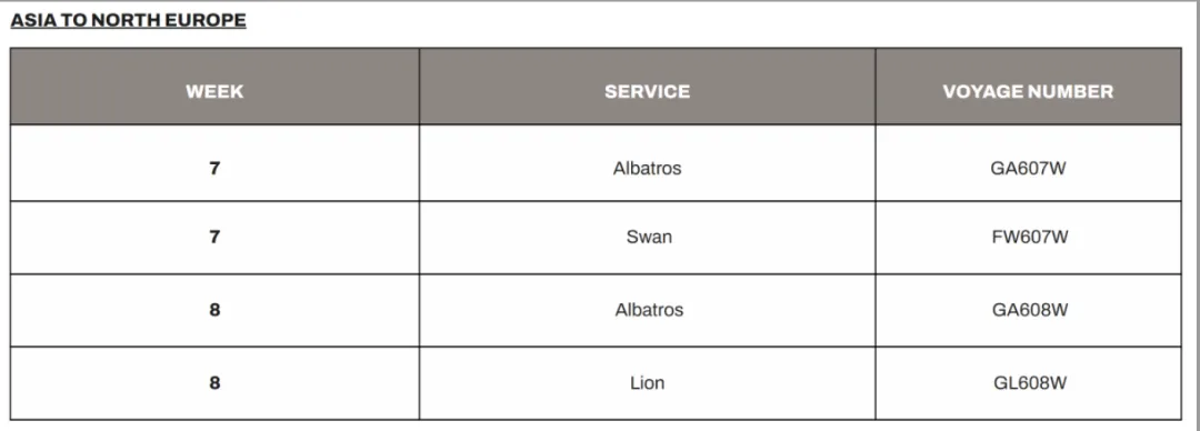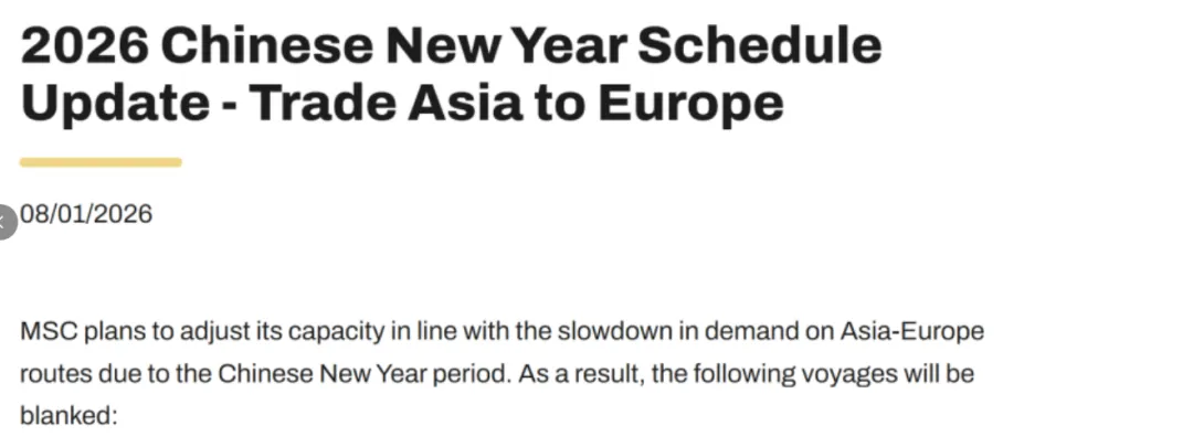 如MSC计划根据中国新年期间亚洲-欧洲航线需求放缓调整运力。因此,以下航次将被停航: