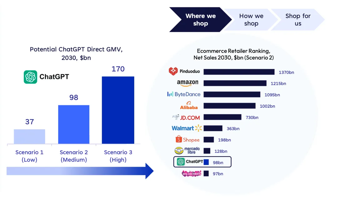 在高增长的情况下,ChatGPT将可能直接跃升为全球前十电商平台。购物搜索占比提升至15%,约30%的交易直接在对话中完成,使其成为“默认购物入口”之一。一旦发生,零售世界的规则将被彻底改写。