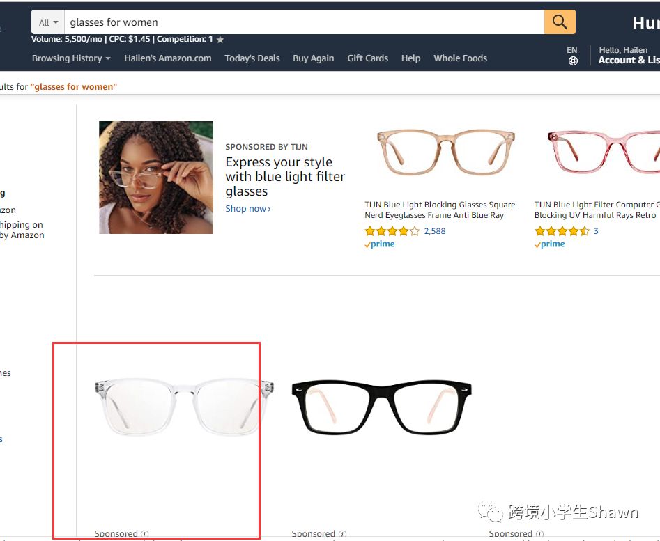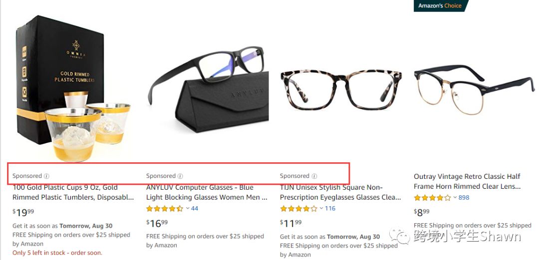 当我们在亚马逊搜索框中输入关键字并显示结果时,部分产品搜索结果带有“Sponsored”字体,这些被视为亚马逊广告。
