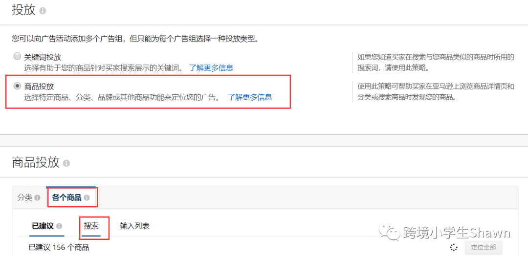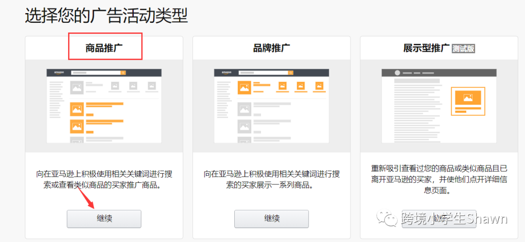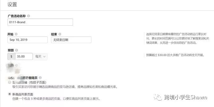 设置广告活动,可以选择投放亚马逊店铺或者新商品列表页面