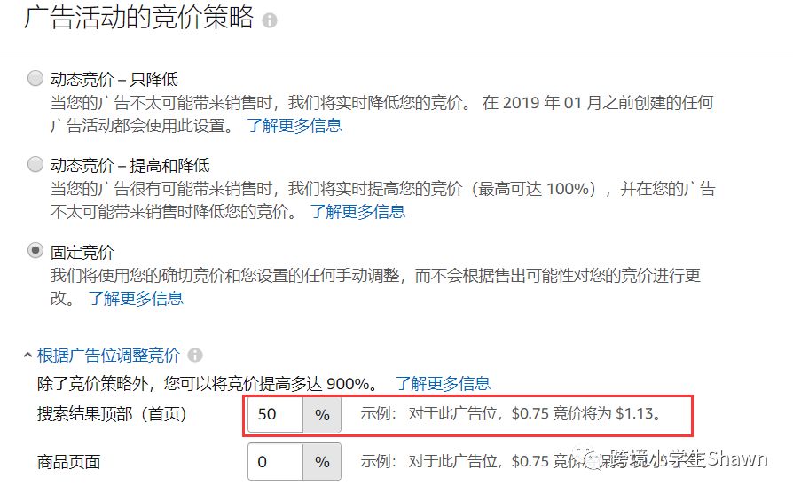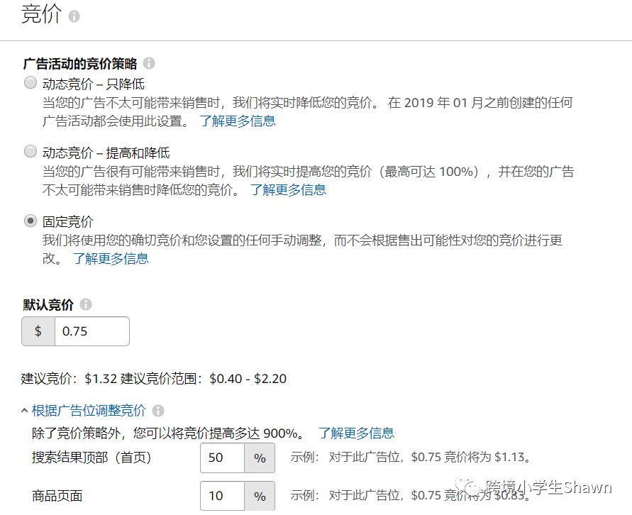 这里需要注意,新品投放一定要选择“固定竞价”或者“动态竞价-只降低”。如果选择“动态竞价—提高和降低”,将会花费很高却没有订单产生,这种选项适合产品有一定的转化率和排名以后,在节日时使用。根据广告位调整定价的竞价策略是,针对产品类目词里面单个词的点击费用参考,对想要卡到首页顶端主坑位的竞价提价幅度建议为20%-50%,不需要出太高的比例,否则会产生浪费。对于产品页面调整比例技巧:我个人建议设置10-20%,因为广告的点击都集中在顶端,中部竞争的意义不是特别大。